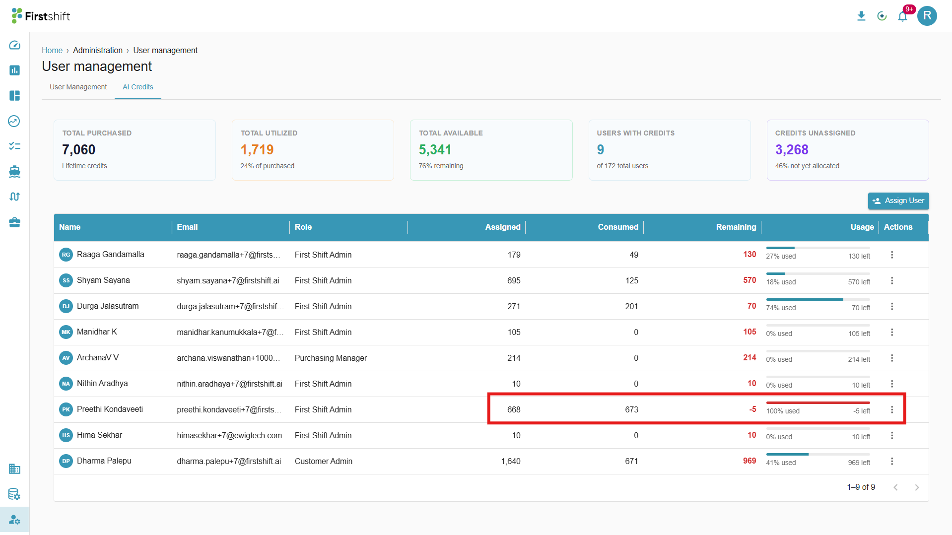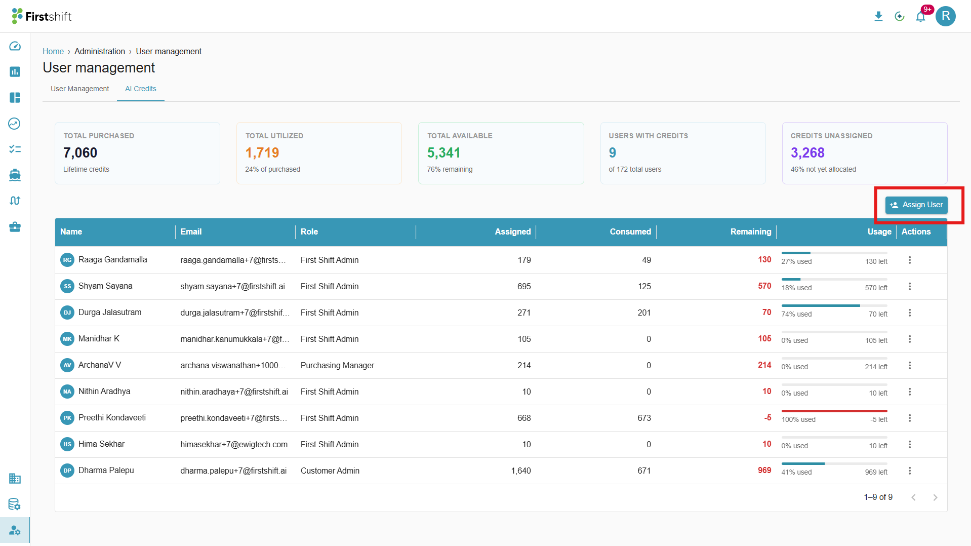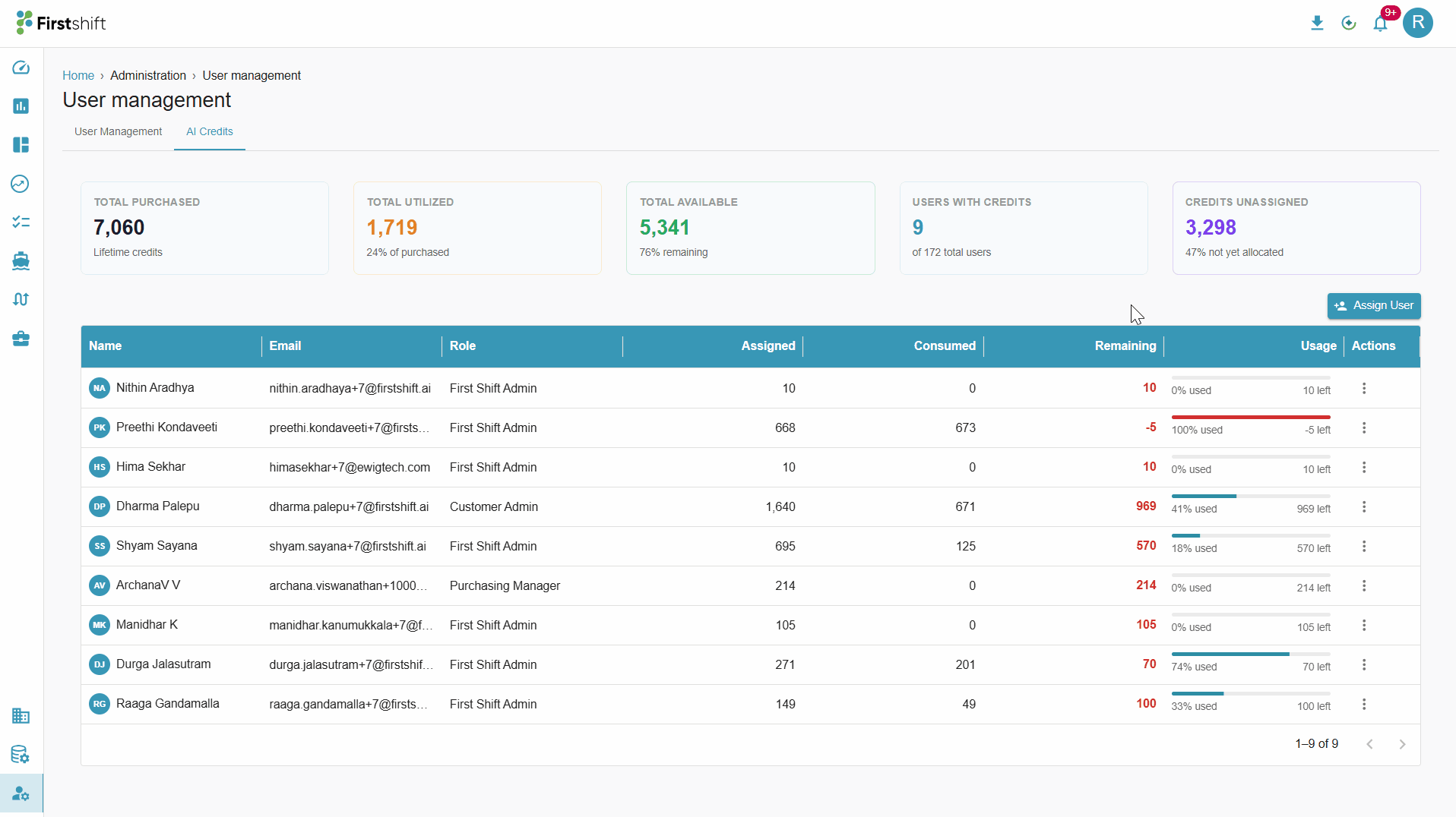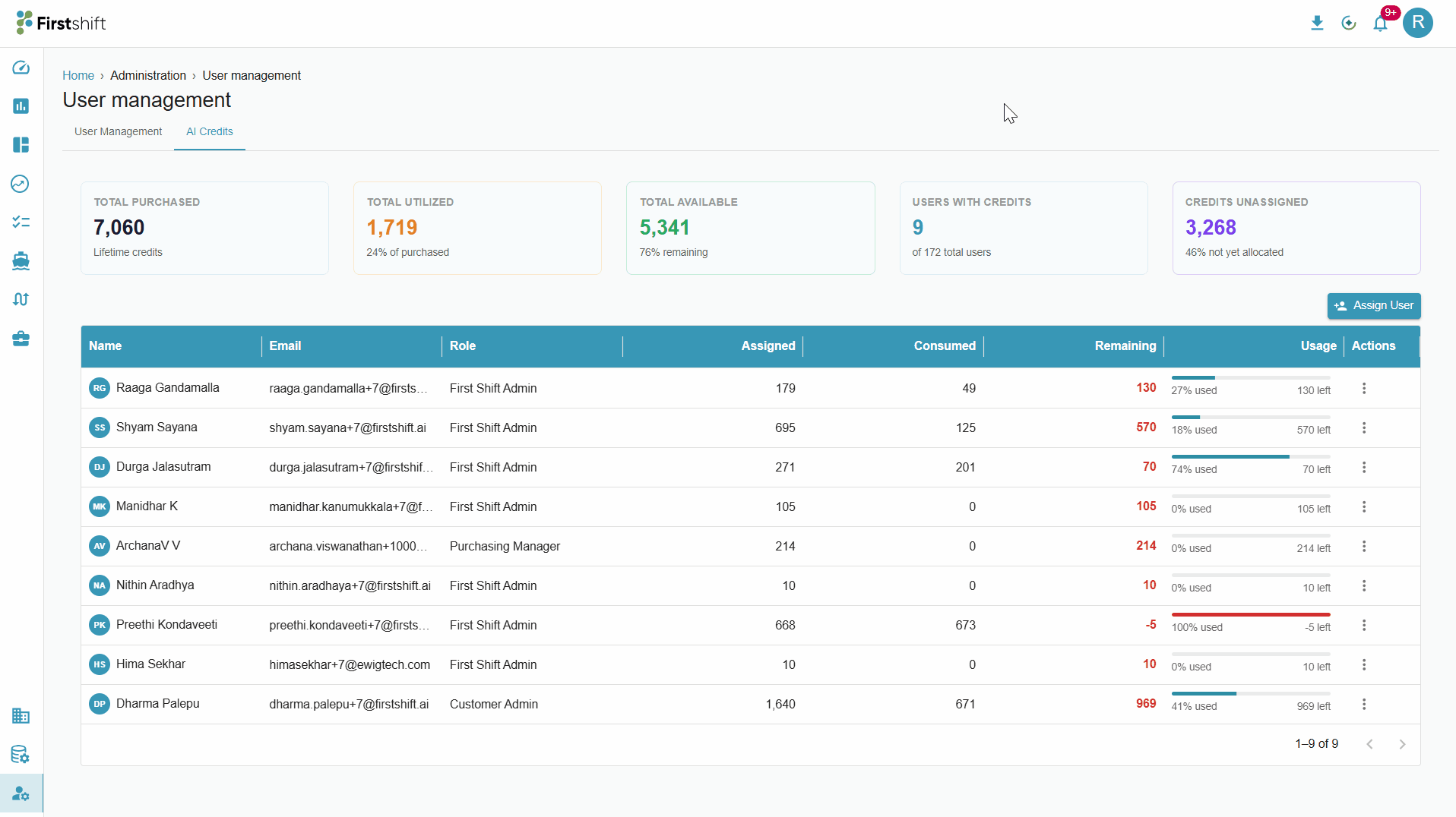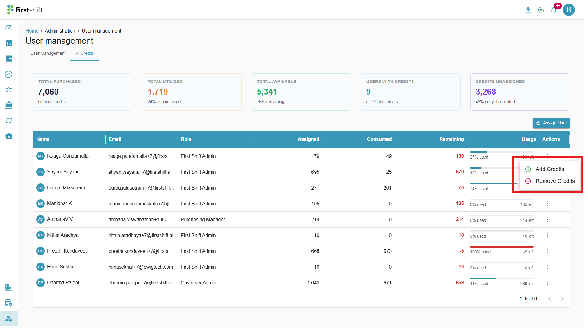 This option allows the Customer Admin to invite the registered users to access Firstshift AI/Agentic capabilities. You can invite a registered user by clicking on the “Assign User” button in the AI Credits tab. This action opens a pop-up that lets you allocate credits to a selected user.